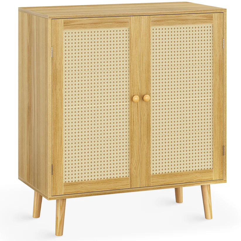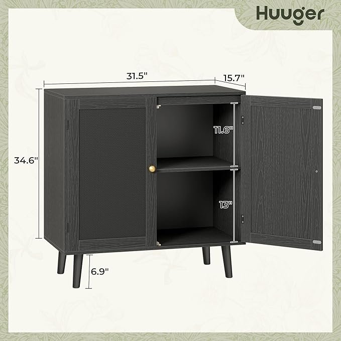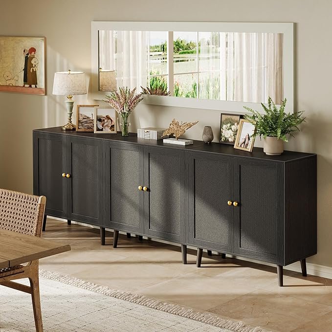 The Huuger Buffet Cabinet combines modern design with practical storage, making it perfect for hallways, entryways, or living rooms. Its sleek black finish and PE rattan-decorated doors add a stylish boho touch, while solid wood feet and sturdy particleboard construction ensure long-lasting durability. With easy assembly and versatile storage space, this sideboard cabinet helps keep your home organized and enhances any interior décor.